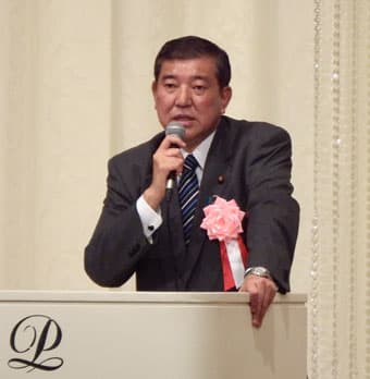 六月二十六日告示の知事選(七月十三日投開票)に向けて、元経済産業省官僚の新人、小鑓隆史氏(47)=自民、公明推薦=の事実上の決起集会となる政経パーティーが先月二十九日、大津市内で開催され、国会議員や県議、支援者ら約千五百人が参加して気勢を上げた。県選出の自民国会議員〇人から衆参五人へ復調した自民は、今回の知事選を重点選挙区に位置付ける。党本部から来場した石破茂幹事長は「党本部として全力を挙げる」と、檄を飛ばした。 【高山周治】