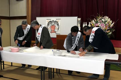 小澤会長は「二十年間の思い出と、未来に託す夢と希望をこの凧に込めます」とあいさつ。小梶猛東近江大凧まつり実行委員会委員長はこれまでの同会の協力に感謝するとともに「濱野芋煮会のつくる凧ということで、本当に楽しみ」と、山田敏一東近江大凧保存会会長も「制作される凧が大空高く舞い上がり、濱野芋煮会の発展を願います」と激励し、期待をふくらませた。