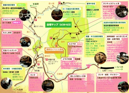 今年で三年目となる。木地師発祥の地の伝統ろくろ製品や漆器をはじめ、木工作家による家具や小物、地域おこし協力隊員による紫草の染色、写真や絵画の作品展のほか、飲食店では石釜パン、有機コーヒーと手づくりケーキ、政所茶、地酒、ランチ、ちらし寿司、こんにゃく、イワナ料理、たこ焼きなど、全十六軒が参加する。