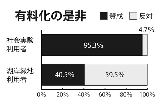 しかし、社会実験利用者以外からは厳しい意見も挙がる。県が今年4月27日~5月31日、社会実験とは別に草津市の帰帆島から守山市の赤野井の都市公園湖岸緑地利用者にインターネットでアンケートを実施したところ、回答のあった153件中、有料化の是非について賛成は40・5%、反対は59・5%と反対が賛成を上回った。