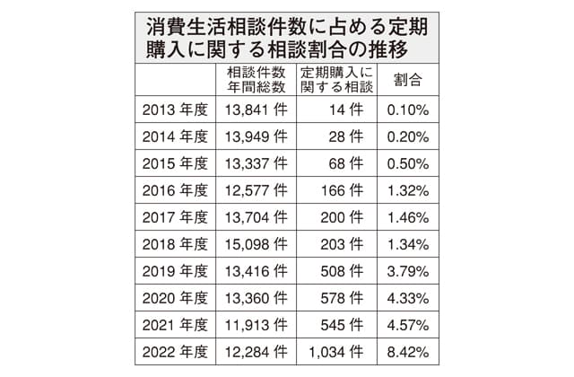 同センターの取りまとめによると、昨年度、寄せられた消費生活相談総件数は1万2284件で前年度から371件増加した。増加の主な要因は、定期購入に関する相談が1034件と前年度より489件増加したことによる。定期購入に関する相談は年々、相談総件数に占める割合が増加している(表参照)。