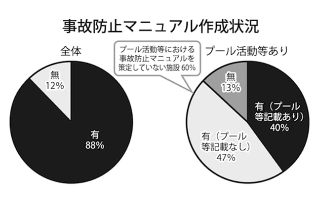さらに、調査から浮かび上がった課題として県は「プール活動をしているが事故防止マニュアルにプールに関する記載がない施設がある」(47%)、「応急手当の講習会等を受講した有資格者がいない施設がある」(17%)なども挙げ、安全計画策定・事故防止マニュアル策定・講習会受講の全てにおいて未実施の施設は県内5施設あったことも判明した。