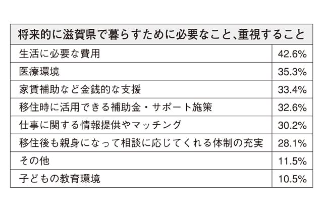 また、「今後、滋賀県で暮らすために必要なこと、重視すること(複数回答可)」の問いでは、「生活に必要な費用」と答えた人が最も多く(42・6%)、次いで「医療環境」(35・3%)、「家賃補助など金銭的な支援」(33・4%)の順となり、費用面と医療面を重視する人が多いことがうかがえる結果となった(表参照)。一方、「その他」(11・5%)には「交通の便、移動手段」や「文化施設、娯楽施設」関係の回答があった。