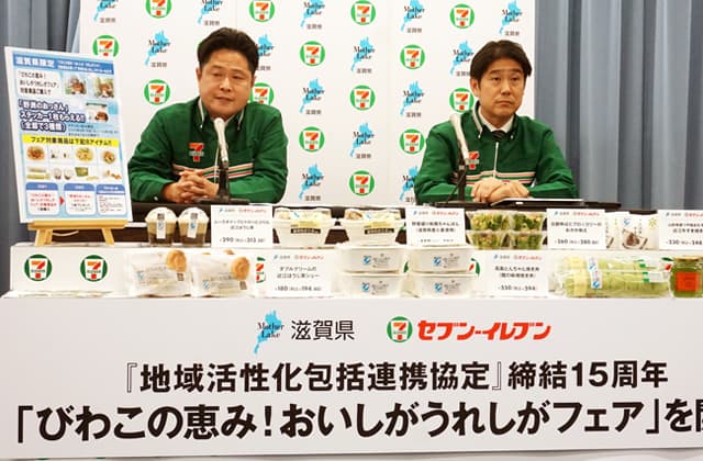 【全県】 コンビニ大手企業のセブン‐イレブン・ジャパン(東京都千代田区、永松文彦社長)では、滋賀県との地域活性化包括連携協定締結15周年を記念し、関西2府4県で滋賀県の優れた食材を用いた商品や滋賀県になじみのあるメニューを商品化したオリジナル商品を販売する「びわこの恵み!おいしがうれしがフェア」を展開している。