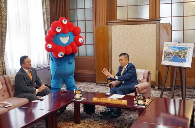【県】 2025年に大阪を主会場に開催される「2025年日本国際博覧会(大阪・関西万博)」への機運を高めることを目的に、このほど開催運営を担う公益社団法人2025年日本国際博覧会協会の堺井啓公担当局長(中小企業・地域連携)と大阪・関西万博公式キャラクターのミャクミャクが県庁で三日月大造知事を表敬訪問した。