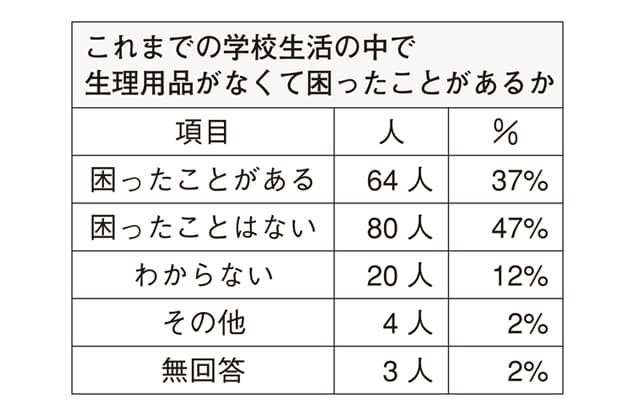 同結果によると、学校生活で生理用品がなくて困ったことが「ある」と回答した児童生徒は全体の37%(表参照)、また、保健室に生理用品をもらいに「行きにくい」と回答した児童生徒は全体の49%だったなど、県内女子児童生徒が日頃感じている悩みの一端が浮かびあがった。同本部では「子どもたちの生の声を行政に生かしてほしい」と呼びかけている。