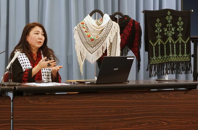 このほど県庁で記者会見を開いた北村さんは「刺しゅうづくりでつながっていた現地の女性たちと、今は安否を確認することもできない」と述べ「復旧までに何年かかるか分からない。今、自分たちにできることでガザに思いをつないでいけたら」と語った。