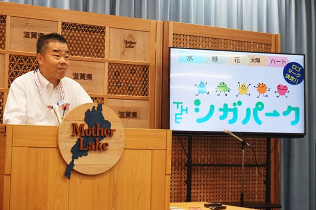 ロゴマークを紹介した三日月大造知事は「地域や利用者と一緒に公園の魅力を発信していく」と述べた。