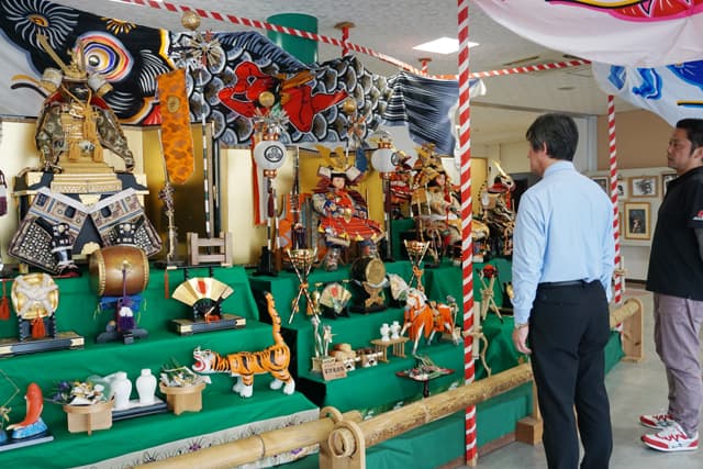 勇ましい五月人形やこいのぼり展示