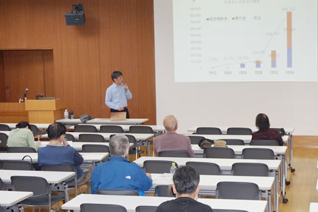 【東近江】 県平和祈念館(東近江市下中野町)の市民教養講座で、龍谷大学文学部の佐々木浩雄教授は、「戦時期の体育・スポーツと国民統合」をテーマに講演し、戦時体制の強化に伴って、国民の身体が体育を通じていかに管理され、国家と一体化していったのか解説した。