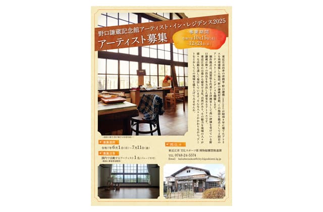 期間は10月15日から12月21日まで。募集人員1人。国内在住者で、アーティストの居住地または所在地から野口謙蔵記念館へ活動日に通えることなどを募集条件としている。