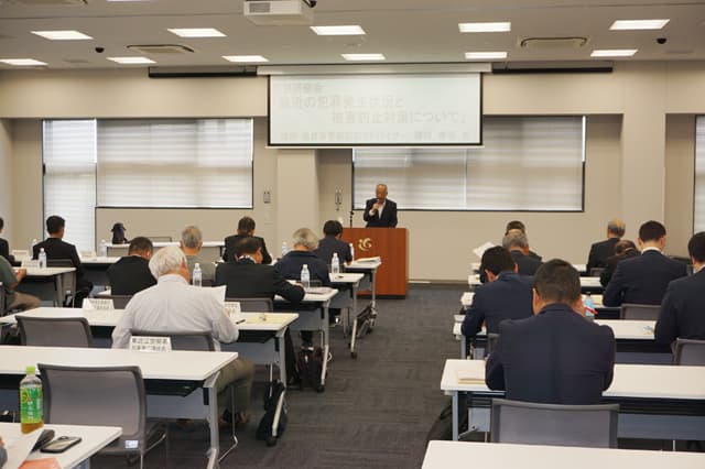 この後の研修では、県警防犯アドバイザーの礒田孝司氏が「最近の犯罪発生状況と被害防止対策」について講演し、具体的な防犯対策を紹介した。