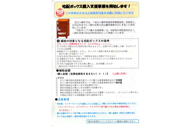 【近江八幡】「気候異常事態」を宣言し、2050年度までに二酸化炭素の排出量を実質ゼロをめざしている近江八幡市は、宅配ボックスの購入補助金の申請を受け付けている。