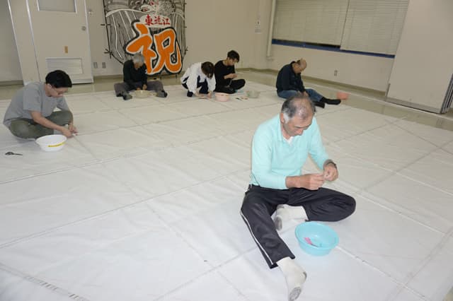 【東近江】今秋、県内で開催される国民スポーツ大会と全国障害者スポーツ大会の総合開会式への出演が決まっている東近江大凧の制作が、大凧保存会によって進められている。会員らは、「県内で数ある文化財の中で、東近江大凧が選ばれたことは大変光栄なこと」と、喜んでいる。
