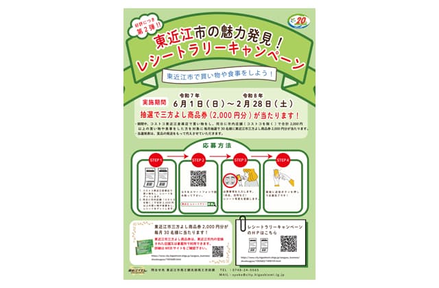 このキャンペーンは、6月から来年2月28日までの期間、毎月30人に東近江市三方よし商品券2千円分が当たるというもの。コストコ東近江倉庫店で買い物したレシートと、同日に東近江市内の店舗で2千円以上(合算可)の買い物や飲食したレシートで応募することができる。